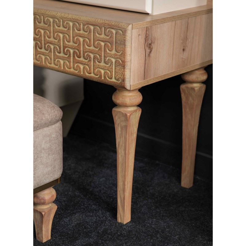 جنس فریم این محصول ام دی اف است و دارای کیفیت بالایی است که از مقاومت خوبی برخوردار است. سایز فریم تخت آن استاندارد است و همچنین جنس پارچه این محصول از مخمل است که از کیفیت و دوام بالایی برخوردار است.پایه های استفاده شده در میز آرایش و پاتختی نیز از چوب مرغوب می باشد و رنگ مورد استفاده در بهای پا تختی و میز ارایش رنگ پلی یورتان و مقامم می باشد.قیمت برای خود تخت خواب همراه با دو عدد پا تختی ویک عدد میز آرایش به همراه پاف صندلی آن میباشد